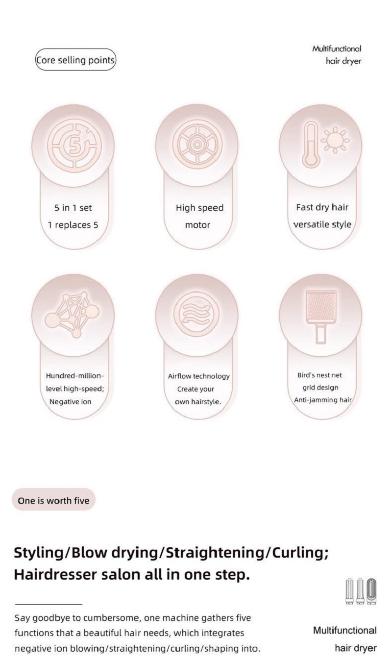 This 5-in-1 hair dryer is amazing! It dries hair fast, styles smoothly, and saves so much space in my bathroom. Perfect for daily use.