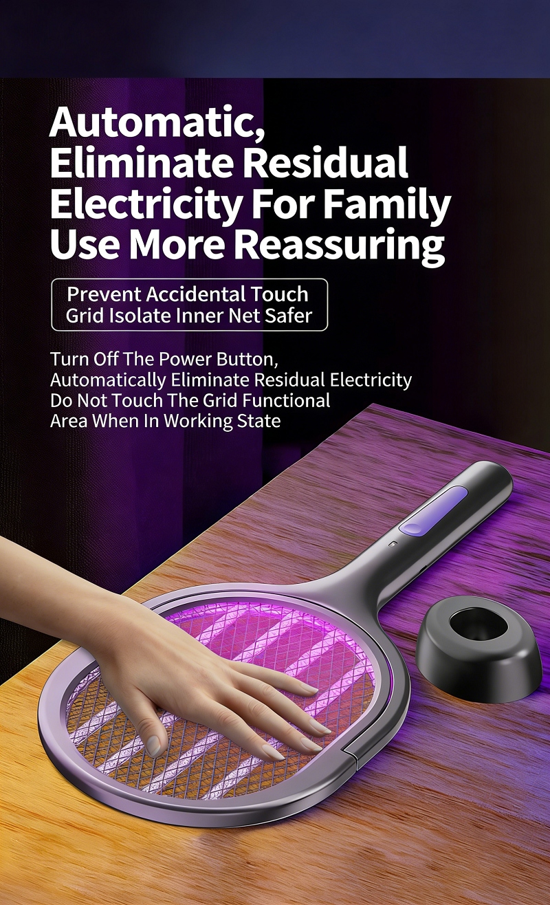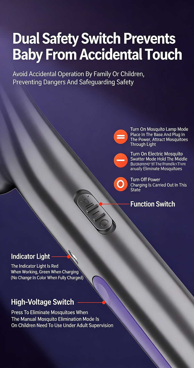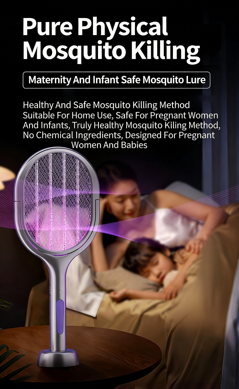 Features anti-miscontact grid, dual safety switch and auto residual power discharge to prevent electric shock for kids. Ultra-quiet operation with soft purple light, no noise or glare, perfect for nighttime use, ensuring a mosquito-free and undisturbed sleep for your family.