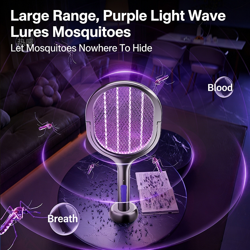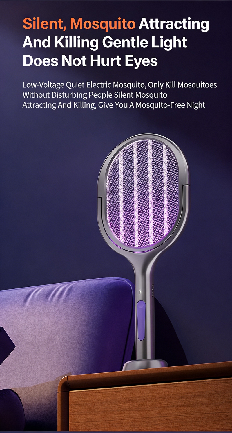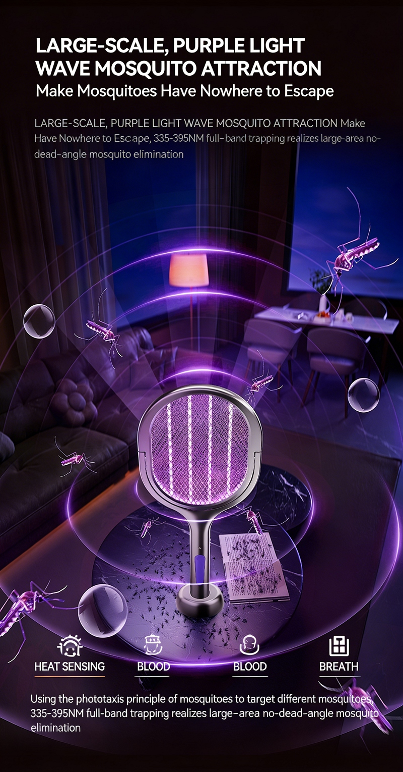 This bug zapper works as both a handheld electric swatter for instant kill, and a standing mosquito trap with purple UV light for 24H automatic luring. Perfect for daytime manual mosquito control and nighttime automatic protection for your whole home.